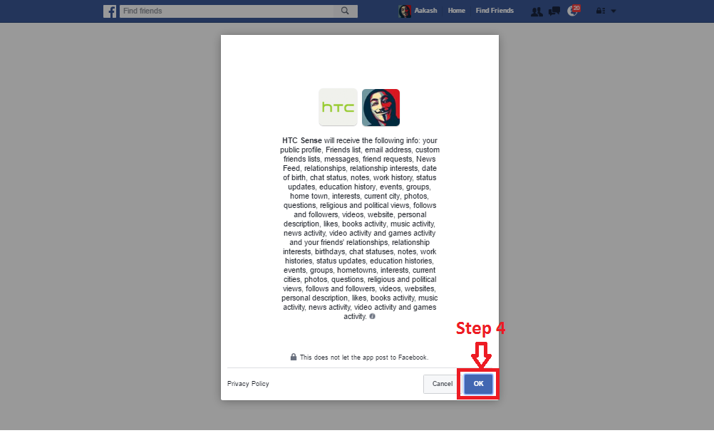 Step 4: Login with Facebook click on OK.